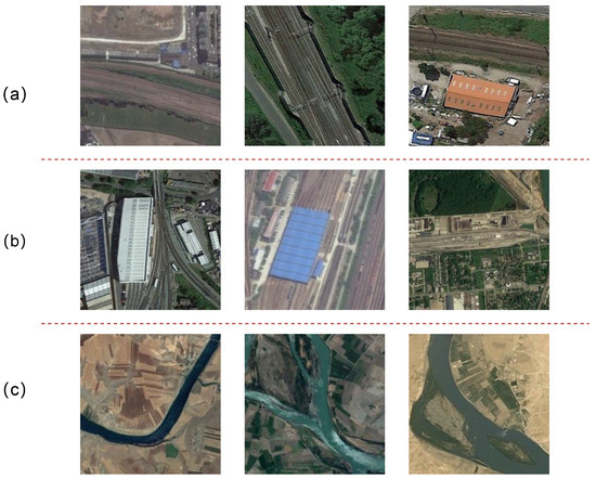 Examples of remote sensing scene images from the NWPU-RESISC45 dataset: (a) railways, (b) railway stations, and (c) rivers. Remote sensing scenes include large variations in object/scene scales and the coexistence of multiple ground objects. As illustrated, remote sensing scenes exhibit high intraclass diversity and interclass similarity.