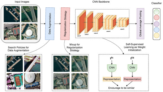 As shown in Figure 3, Starting from the overall training process, we consider various elements of the process to address the degradation of RSSC model training without ImageNet pretraining. For the initialization of the weights, we employ SSL to learn the characteristics of the remote sensing images themselves. Data augmentation and regularization strategies are also important when the amount of data is insufficient. For data augmentation, we learn suitable data augmentation strategies specific to RSSC datasets. For regularization, we use Mixup as the regularization strategy.
