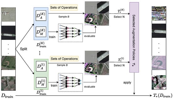 The whole process is illustrated in Figure 5. First, the training dataset is split into K folds, each of which consists of two datasets, and . For each fold, we train a model based on and obtain the model parameters . After the parameters are trained, B bundles of augmentation policies are sampled from sets of predefined data augmentation operators. Then, based on the evaluation results for model , the top N policies in B are selected to obtain on . Finally, the top N policies obtained from each of the K folds are appended to an augmentation list .