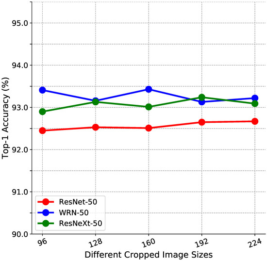 In SSL, the size to which the images are cropped is an important factor affecting the time and computational effort of training. Because of the large dissimilarities between remote sensing images and natural images, to explore the effects of different image resolutions on the characterization ability of the network, we compare the top-1 accuracies achieved under different random crop sizes in Figure 6. From the results in this figure, it is obvious that SSL is not highly sensitive to the crop size for remote sensing images. If the crop size is increased, it will bring more GPU hours and memory usage. Considering training time and resource consumption, we adopted a crop size of 96 in the subsequent SSL experiments.
