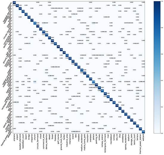 The NWPU-RESISC45 dataset is still a challenging dataset, on which the performance achieved has not yet been saturated. Even for this dataset, WRN-50+GFSC achieved remarkable performance, with overall accuracies of 93.13% and 94.82% for training ratios of 10% and 20%, respectively. We show an example of the category-level classification results in Figure 7.
