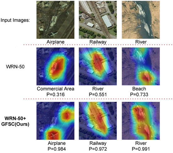 As shown in Figure 9, these selected scene images are sampled from the NWPU-RESISC45 validation set. These samples are very difficult to distinguish and the baseline model cannot classify them correctly. Specifically, we compared the prediction labels and confidence scores obtained using a GFSC-trained network (WRN-50+GFSC) with those of the corresponding baseline model (WRN-50) based on ImageNet pretraining. As Figure 9 shows, the networks trained under GFSC have stronger abilities of feature extraction. It is clear that GFSC-trained network better captures the details representing semantic features in complex contextual scenes. Compared with the baseline model, it not only classifies correctly but also obtains higher confidence in the classification results for some difficult scenes.