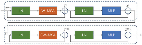 In recent years, transformer blocks have shown superior performance in visual tasks as compared to equivalent CNN modules. Microsoft utilized CNN design principles to design the Swin Transformer [37] block, which divides images into smaller patches based on a shifting window. Computing only the self-attention within each window is much less complex than calculating the self-attention between all pixels. Moreover, using the design principle of shifting windows, attention information can be exchanged between adjacent windows, effectively utilizing the relative position information. Unlike the conventional multi-head self attention (MSA) module used in ViT, the Swin Transformer block can be thought as a series of two modules: a regular window-based MSA (W-MSA) module, and a shifted window-based MSA (SW-MSA) module.In model design, W-MSA and SW-MSA are usually applied consecutively to ensure that attention between windows is not limited to a single area. Figure 1 illustrates a common configuration of two consecutive Swin Transformer blocks.