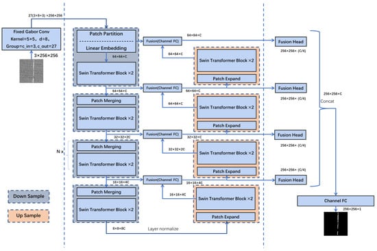 To solve the local optimal fitting problem of transformer-based models in fabric defect segmentation, we designed a network based on Swin-UNet. The overall architecture of the model is shown in Figure 2. In this section, we introduce the three stages of the model separately: (1) the fixed Gabor filter for preprocessing fabric texture features; (2) the U-shaped Swin Transformer Nntwork for defect segmentation; and (3) multi-stage result fusion for precisely locating defects.