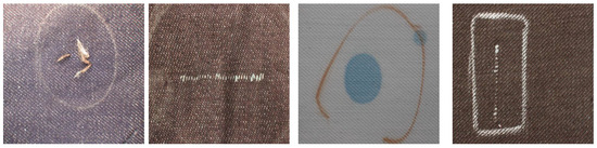 - One Class Fabric: this dataset was sourced from Hao Zhou et al. [42], and contains 150 fabric images with more complex background textures than the previous two datasets. The dataset covers different fabric backgrounds, defects, and colors. Figure 6 shows typical defect images.