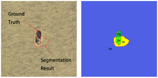 In order to quantitatively evaluate the performance of the method proposed in this paper, we introduce four different evaluation indexes: accuracy (ACC), sensitivity (SE), precision (PC), and intersection over union (IoU). ACC represents the correct classification rate of all pixels, SE represents the correct classification rate of defective pixels, PC represents the proportion of ground truth in the segmented pixels, with a focus on determining whether the predicted mask accurately covers the ground truth, and IoU calculates the overlap rate between the segmentation results and the ground truth, which is the ratio of their intersection and union. Their formulae are as follows:
