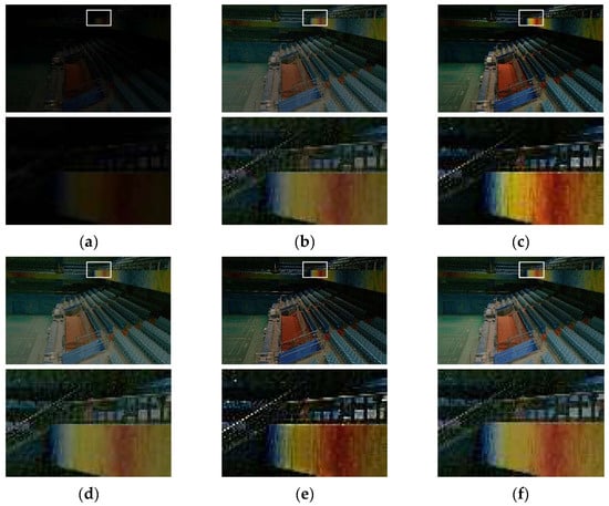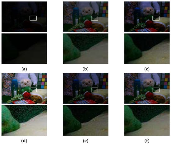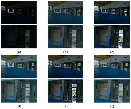Figure 2, Figure 3, Figure 4 and Figure 5 show the low-light image and the enhanced and enlarged images, where (a) is the low-light image, (b–e) are the results of processing with existing techniques, namely, dark light [23], LIME [8], RBMP [24], and LIIEN [4], respectively, and (f) shows the result of processing with the proposed technique.