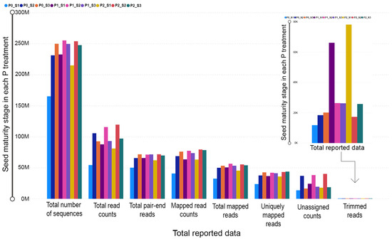 The bar chart indicates the differences among the pod maturity stages (S1, S2 and S3) in each P treatment (P0, P1 and P2) from the summarized data obtained from the MultiQC report following RNA sequencing procedure.
