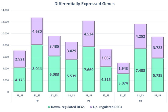 Of the total 19,894 unique genes, 2432 were only identified in the P0 treatment, 1375 were found in P1, and 1099 in P2, while all three treatments shared a common 10,401 DEGs (Figure 2). The comparison between the S1 and S3 in the P0 treatment (S1–S3) retained the highest numbers of upregulated and downregulated DEGs, having 8044 downregulated and 4680 upregulated, while the lowest in-rank DEGs were revealed in P2 treatment between the first seed maturity stage and the second (S1–S2), with 3074 down-regulated and 1943 up-regulated DEGs (Figure 3 and Table 3).