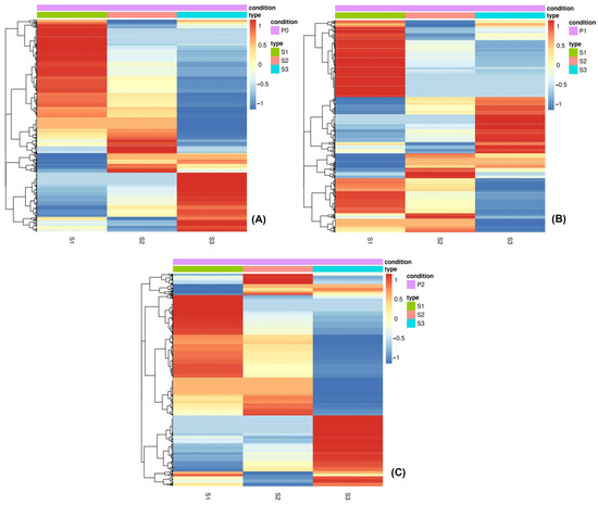 Individual heatmaps outlining the DEGs (DEGs) in P0 (A), P1 (B) and P2 (C) conditions. The expression is reported in log2(fold change) with z-score normalization. The hierarchical clustering was performed utilizing the Euclidean distance metric, and the clustering method includes the DEGs with expression levels in terms of −1 ≥ log2(fold-change) ≥ 1, while also ensuring their significance using a cut-off of an adjusted p-value ≤ 0.05. DEGs were clustered together according to seed maturity stage (S1, S2 and S3), and the z-scores from 1 to −1 indicate the intensity linked with normalized expression. The darker the red color is, the more upregulated the genes are, and the darker the blue, the more downregulated the genes are.