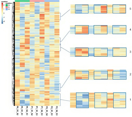 The differential gene expression analysis was conducted by implementing hierarchical clustering with Euclidean distance metric on DEGs with expression levels of −1 ≥ log2(fold-change) ≥ 1, while also ensuring their significance using an adjusted p-value ≤ 0.05; this was visualized using heatmaps of their expression levels. Firstly, the differential expression of significant genes was analyzed for each P treatment separately, showcasing the DEGs’ expression patterns among the three seed maturity stages (Figure 4). The expression patterns of the DEGs appear to be similar in the P0 and P2 treatments, while the expression patterns in the P1 treatment differ. This observation suggests that an intermediate P dosage may have a more substantial impact than a higher dosage. Based on the individual P treatment heatmaps, in all three treatments, it is observed that the seed maturity stage is an important factor that affects DEG expression. Secondly, the differential expression of the significant genes was analyzed in all three P treatments and seed maturity stages simultaneously. According to the overall heatmap, there is no particular clustering pattern of DEGs. The effect of the seed maturity stage on DEGs’ patterns implies that this factor plays an essential role in lentil genes’ expression.