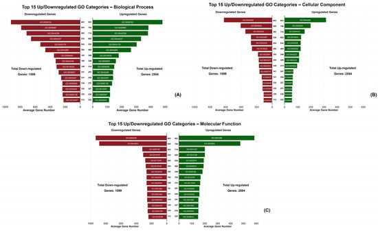 The butterfly charts indicate the number of upregulated and downregulated DEGs corresponding to the top 15 GO terms in each GO category (biological process (A), cellular component (B) and molecular function (C)).