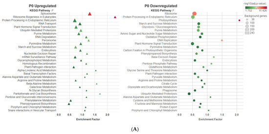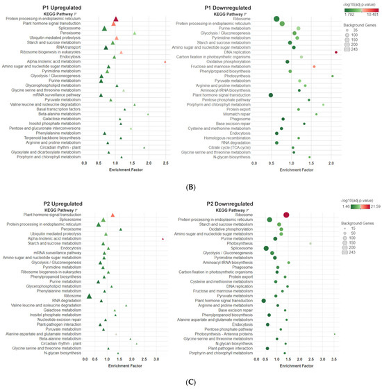 The bubble plots represent the KEGG pathways in each P treatment ((A) P0, (B) P1 and (C) P2) where the upregulated and downregulated DEGs were found. The X-axis represents the enrichment factor (DEGs enriched in a pathway/genes of all genes in the background gene set). The Y-axis represents the biosynthetic pathway, the size of the bubble indicates the amount of the DEGs and the color depends on the significance of the enrichment expressed in the −log10(q-value).