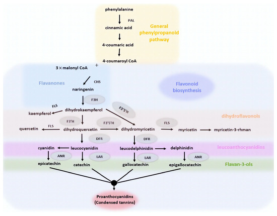 Schematic illustration of the phenylpropanoid pathway leading to tannin formation in the lentil seed coat. The pathway demonstrates all the intermediate interventions of the enzymes contributing to proanthocyanidins biosynthesis. Abbreviations: PAL, phenylalanine ammonia lyase; CHS, chalcone synthase; F3H, flavanone-3-hydroxylase; F3′5′H, flavonoid-3′,5′-hydroxylase; FLS, flavonol synthase; DFR, dihydroflavonol 4-reductase; ANR, anthocyanidin reductase; and LAR, leucoanthocyanidin reductase.