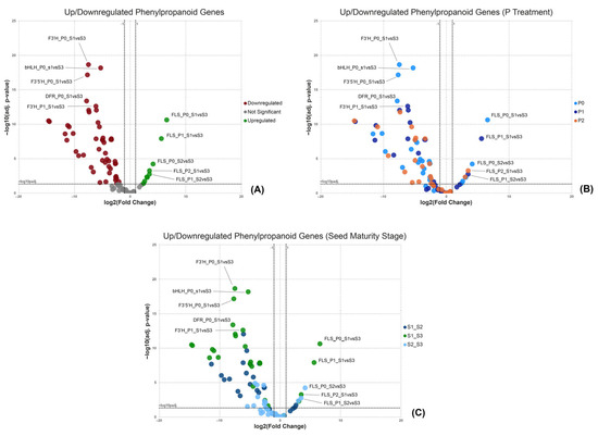 Volcano plots demonstrate the upregulated and downregulated DEGs related to the phenylpropanoid pathway. (A) Total DEGs related to the phenylpropanoid pathway, (B) DEGs among the P treatments considering the P0 as the control condition and (C) DEGs among the pod maturity stages in each P treatment considering the S1 as the control stage. X-axis: −log10(q-value) and Y-axis: −log10(0.05).