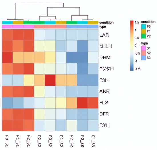 RNA sequencing expression data were validated through RT-qPCR for four selected genes that seem to have a key role in the phenylpropanoid biochemical pathway. The log2(fold-change) expression values of the selected genes (bHLH, F3′H, DFR and DHM) when compared to the log2(fold-change) expression data derived from RNA sequencing, were found to be in accordance (Figure 11). The expression of the majority of the selected genes demonstrates a downregulation pattern across all treatments, with the most pronounced downregulation observed in the S1–S3 treatment. Regarding the bHLH TF, the most substantial downregulation is in the S1–S3 comparison in the P0 treatment and in the S1–S2 in the P1 and P2 treatment. The expression of F3′H is remarkably downregulated in the S1–S2 in the P0 and P1 treatments and in the S1–S3 in the P2 treatment. The expression of DFR in the S2–S3 is upregulated in all three treatments, while the most prominent downregulation is observed in S1–S2 in the P2 treatment. The DHM gene exhibited its most substantial downregulation peak in the S1–S3 treatment.