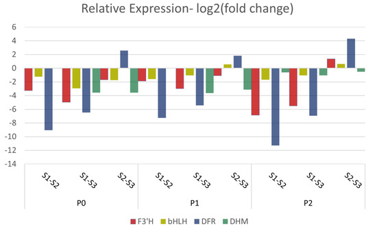 RT-qPCR showing the relative expression of F3′H, bHLH, DFR and DHM between the S1 and S2 and the S1 and S3 stages, using S1 as control, and between the S2 and S3 stages, using S2 as the control, in all three P treatments.