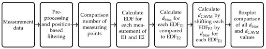 To answer the research questions, a methodology based on the so-called DVM introduced by Rosenberger [] (pp. 118,119) is used. The corresponding process is visually illustrated in Figure 1. In the first step, the measurement data for the different experiments is collected. We gather multiple measurements per experiment setup. After pre-processing and position-based filtering of the measurement data, the number of resulting measurement data points is compared between the respective measurements or experiments. We name this filtered area region of interest (ROI). The comparison of the overall number is due to the condition that this deviation must be small for the DVM to be used [] (p. 103). The DVM is based on a comparison of the EDFs of the measured data and, therefore, the underlying distribution. Rosenberger’s approach uses the area validation metric of Roy et al. [] (p. 307) and extends it by a second factor to evaluate the EDFs. In contrast to Rosenberger, we do not summarize the individual distribution functions of the measurements, but evaluate the differences of the EDFs individually. Therefore, the area between all the resulting distribution functions is determined, which is a measure for the deviation of the mean value denoted as of the measurements and experiments. Therefore, the mathematical description for results with denoted as the first EDF, denoted as the second EDF, denoted as the area between and , where and denoted as the area between and , where , in