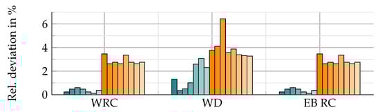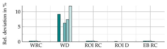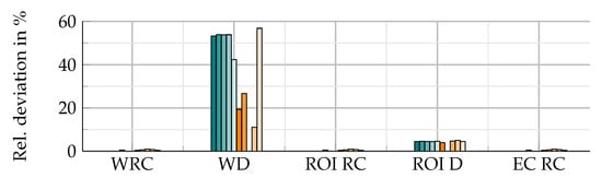 Plot of the relative deviation for the number of the data points or detections of all measurements of the CCR experiment. The evaluation is shown for the WRC, WD, the ROI RC and the ROI D, as well as EB RC. The gradations of the respective color delineate the different measurements.