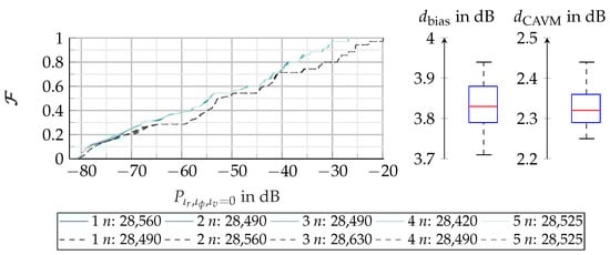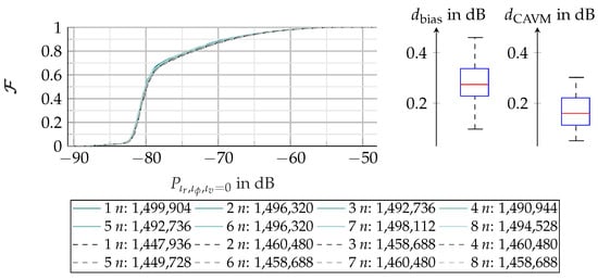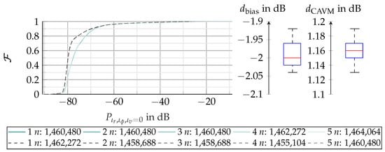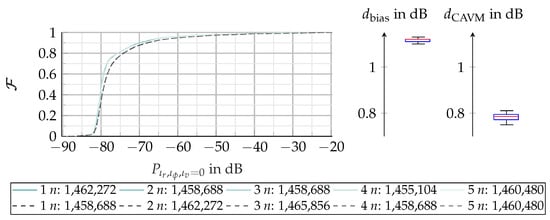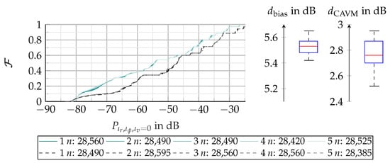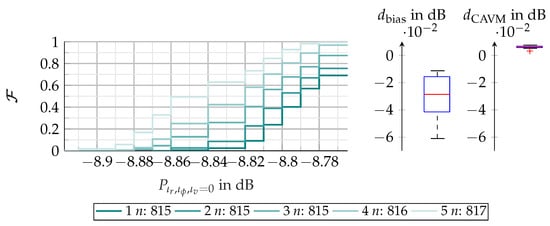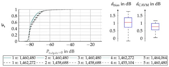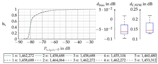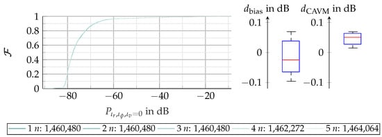Figure 6 shows the same structure as in the previous evaluations. However, in this case, only the bin of the radar cuboid and therefore the power where the CCR is located are analyzed. The distribution functions show a slight deviation from each other. This is also reflected in the two metrics. The deviations in show a spread of 0.045 dB and a much smaller spread in . This shows that the repeatability of the experiments for the CCR is even higher in comparison to the whole radar cuboid. This evaluation is therefore suitable for validation measurements in the case of this sensor for point targets.