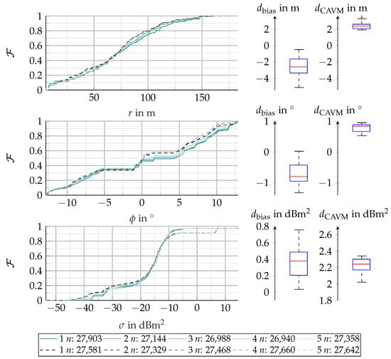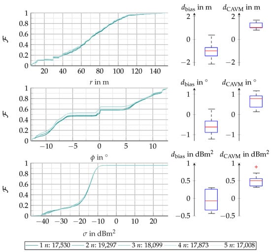 Figure 22 shows the EDFs for the distance, azimuth, and RCS, as well as a corresponding box plot for them. A look at the EDFs for the distance shows that these are similar to each other, but a deviation is still visible. In the distance of the vehicles at 29.65 m, a small step and thus an accumulation of detections can be seen. All detections extend over a maximum distance of 150 m. In the vicinity of the sensor, these detections result from reflections of the road surface and, with increasing distance, from the transition between road and vegetation. Whereby it can be seen from the course that at distances over 115 m, fewer detections can be recognized. Above 160 m, only isolated detections with a low RCS are present, which argues for purely stochastic causes. The median values for and are similar when considered as absolute values. However, the scatter of at 5 m is significantly larger than the scatter of at 1 m.