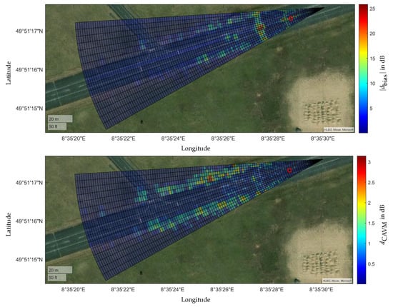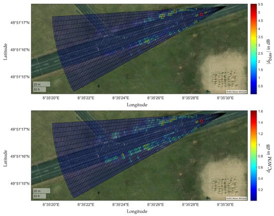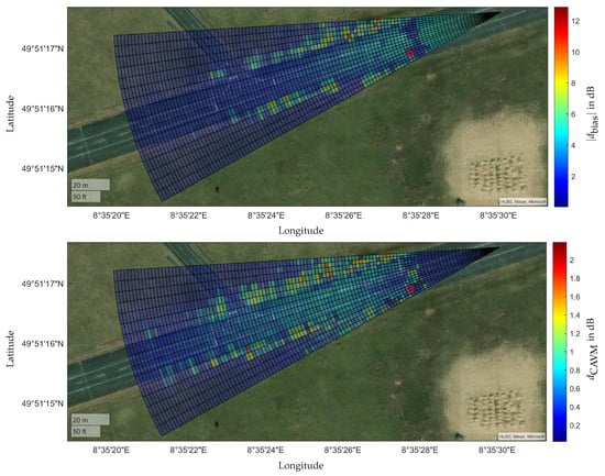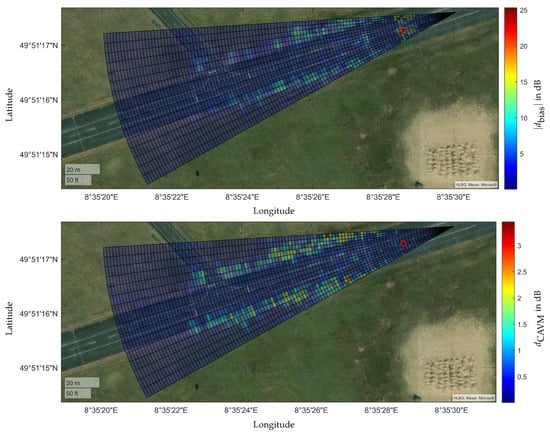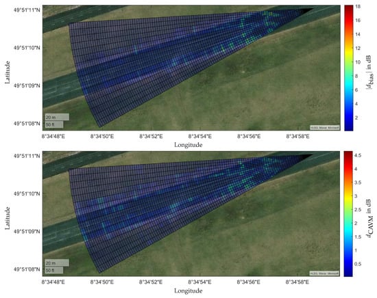 For a detailed analysis of the environmental influence on the repeatability of the radar cuboid, the EDFs are compared using and for each individual range azimuth bin. For this purpose, the respective maximum of and of the corresponding range azimuth bin are visualized with a satellite image and the radar position measured by the GNSS sensor. This makes it possible to interpret the causes of anomalies and assign them to areas in the radar FoV. The result is shown in Figure 8.