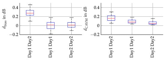 To support this observation, Figure 11 shows the comparison of and for Day 1/2, Day 1/1 and Day 2/2. It can be seen that reconfiguring the measurement setup has a greater effect than taking several measurements in succession. With the method presented, this effect is quantifiable via the scatter of the two metrics, and the reproducibility is measurable.