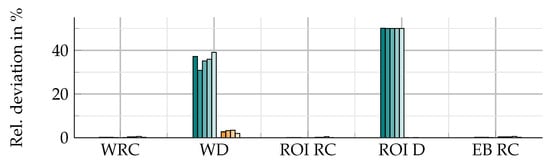 Plot of the relative deviation for the number of the data points of all measurements of the two experiments (XC90 and Vito). The WRC, WD, the ROI for the ROI RC and the ROI D, as well as EB RC are visualized. Experiment 1 is denoted as