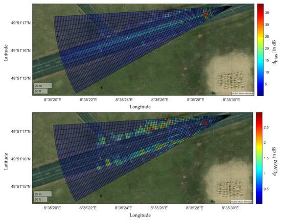 The satellite image in Figure 27 clearly shows the effect of the rain. The increased power is shown in both and . In particular, is increased in the vicinity of the sensor and up to about half of the FoV. The road surface is particularly affected by this phenomenon. For , the largest deviations occur in the medium range of the FoV. Furthermore, the road is more affected than the vegetation, which can be explained by the previously identified stochastic properties of the vegetation.