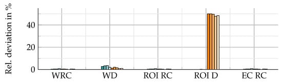 Also for the investigation of the environmental conditions, in this case rain, a difference of the relative deviations for the number of data points is shown (see Figure 25). On the detection level, the deviation is higher than on the radar cuboid level. However, the deviations for the evaluation of all detections are many times higher than those for the detections from the ROI. The rain increases the number of detections. Therefore, the evaluation is examined at the radar cuboid level. The relative deviation is similar for every evaluation on the radar cuboid level and below 1%.