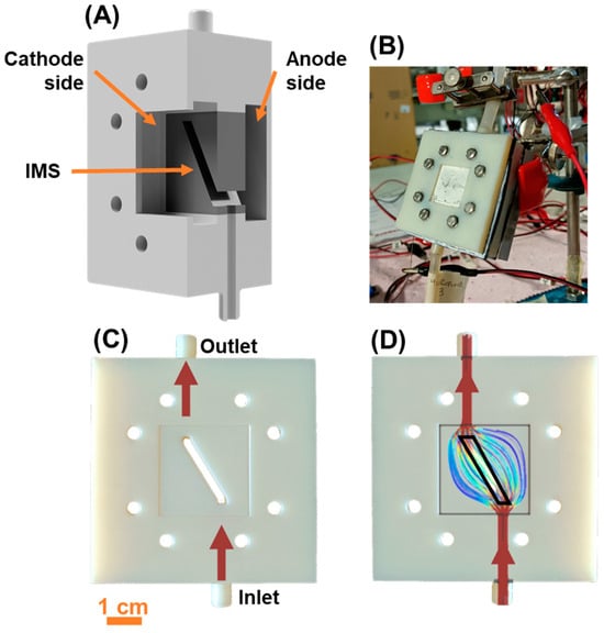 (A) Cross-sectional view of an a-SCMFC featuring the intermediate microfluidic septum proposed in this work. (B) Picture of an IMS cell connected to the experimental apparatus. (C) Intermediate spacing including the IMS proposed in this work. (D) Comparison with the flow field (without IMS) modeled in previous studies. The image of the flow field was adapted and re-printed with the permission of John Wiley and Sons from the article: [].