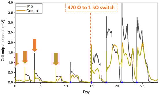 Indeed, Figure 2 demonstrates how the output potential provided by the IMS was immediately comparable with that of the control cells, thus leading to confirmation of the correct proliferation of biofilm on the anode electrodes. Moreover, it was possible to appreciate that the IMS achieved reproducible voltage peaks within the first electrolyte replenishment. In comparison, control cells steadily reached the value of the first peak, but not until the third electrolyte replenishment (see Figure 2).