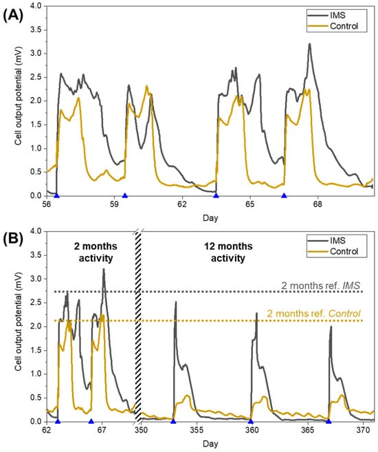 (A) Cell output potential measured after two months of activity during the standard working period. Each blue triangle represents one replenishment with electrolyte solution (12 mM sodium acetate concentration). It is possible to observe how the IMS cells provided peaks broadened in time compared to the control cells. (B) Comparison of cell output potential measured after two months (left) and one year (right) of activity. Each blue triangle represents one replenishment with standard electrolyte solution (12 mM sodium acetate concentration).