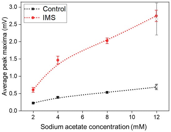 From the measured output potentials, it was possible to extract the maximum values reached by the cells after each refill. To reduce fluctuations associated with each cell, the measured maxima were averaged over each a-SCMFC triplet. Figure 4 represents the average peak maxima observed at different concentrations of sodium acetate in the electrolyte refill. It is possible to observe how the IMS cells systematically provided a higher output potential compared to the control cells. Indeed, at the standard 12 mM sodium acetate concentration, the IMS cells featured, on average, a maximum peak potential of (2.8 ± 0.2) mV, compared to the control cells at (0.68 ± 0.07) mV. Even at sodium acetate concentrations as low as 2 mM, the IMS cells provided average peak maxima at (0.60 ± 0.07) mV, higher than the control cells at (0.22 ± 0.02) mV.