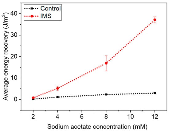 To fully assess the a-SCMFCs’ performances, the energy recovery parameter previously defined in Equation (1) was also considered [,,,,,]. Thus, instead of only focusing on the maximum output potential of the MFC, the Erec parameter considers the power output from the a-SCMFCs. Figure 5 represents the average energy recovery calculated at different concentrations of sodium acetate in the electrolyte refill. These average values were obtained by aggregating measurements from a-SCMFCs, as previously carried out for peak maxima analysis. Considering the standard 12 mM sodium acetate concentration, the IMS cells featured an average energy recovery of (37 ± 1) J/m3, one order of magnitude higher than that reached by the control cells (3.0 ± 0.3) J/m3. Also, for the minimum sodium acetate concentration (2 mM), the IMS cells outperformed the control cells, providing (0.8 ± 0.2) J/m3 and (0.18 ± 0.03) J/m3, respectively. It was then possible to verify how IMS cells provided higher Erec compared to the control cells, thus providing an optimization of the a-SCFMC design.