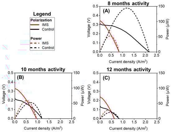As the output potential of a-SCMFCs had been monitored for a prolonged period of time, it was possible to assess the long-term stability of their electrical output performances. Figure 3B allows us to compare the performance of IMS and control cells after two months and after one year of activity, thus leading us to state that IMS cells reached the maximum output potential of (2.8 ± 0.2) mV, which was one order of magnitude higher than that achieved by control cells, equal to (0.68 ± 0.07) mV. Moreover, from Figure 3B, it was possible to highlight how control cells experienced a higher decrease in electrical output performance compared to IMS cells. Thus, over time, the presence of the IMS provided steadier cell electrical activity.