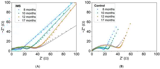 EIS characterizations performed on two representative cells, (A) IMS and (B) control, throughout the experiment lifetime. Data acquired at 8, 10, and 12 months belong to the standard working phase, while the curve at 17 months corresponds with the conclusion of the perturbation phase.