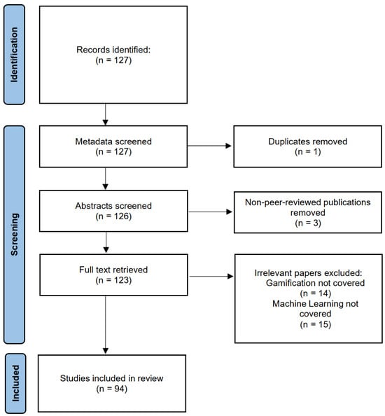 Figure 1 shows the flow of the data collection and qualification process. Although only one bibliographic database has been used, one duplicate item has been found in the results. Also, although only peer-reviewed publication types were targeted by the search query, three non-peer-reviewed publications have been found. Moreover, 29 papers mentioned both machine learning and gamification in their abstracts, but were actually devoted to only one of these two. All such irrelevant papers have been removed, leading to a total of 94 papers qualified for further analysis.