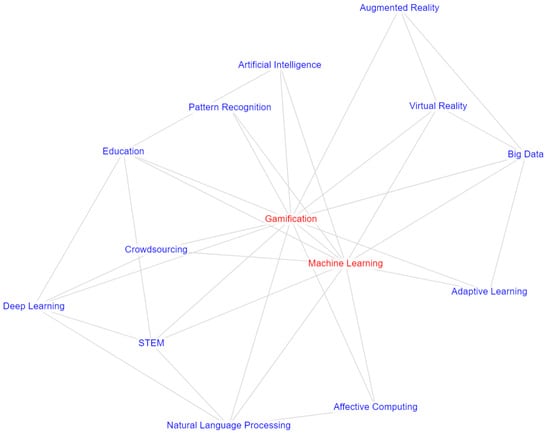 The main point of our research was the mapping of publication themes. This kind of analysis can be performed in two ways: bottom-up or top-down. In the first way, the starting point is the list of topics indicated by the respective publications’ authors themselves, possibly as keywords, which are then clustered to reveal more general themes (see, e.g., [12], especially Section 3.2 therein, for an example of following this scheme). The bottom-up approach is, however, poorly suitable for an investigation like the one performed here, where the focus is on the intersection of two research areas and the character of the relations between them, which is rarely reflected in the most frequently used authors’ keywords (which form the seeds of the clusters). For instance, in our research, the top keywords by frequency included, apart from the search keywords (Gamification and Machine Learning), the indications of the application area (Education, STEM), the supported processes (Crowdsourcing, Adaptive Learning, Affective Computing, Natural Language Processing), the supported technologies (Augmented Reality, Virtual Reality), and the enabling environments (Big Data) (see Figure 2; the terms included in the query are shown in red color).