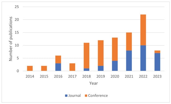 The two earliest identified relevant works were published in 2014 [14,15]. Both were conference papers, the first journal papers appearing only two years later [16,17,18]. The number of published conference papers surpassed the number of journal articles in every considered year. In the entire period, conference publications constituted almost of the relevant papers analyzed.