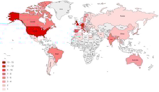 As can be observed in Figure 4, the analyzed publications were written by authors hailing from 43 countries from all inhabited continents. The largest pool of papers has been delivered by authors from the United Kingdom (15 publications in total), followed by the USA (14 publications) and Germany (11 publications). No other country has surpassed the threshold of 10 contributed publications.