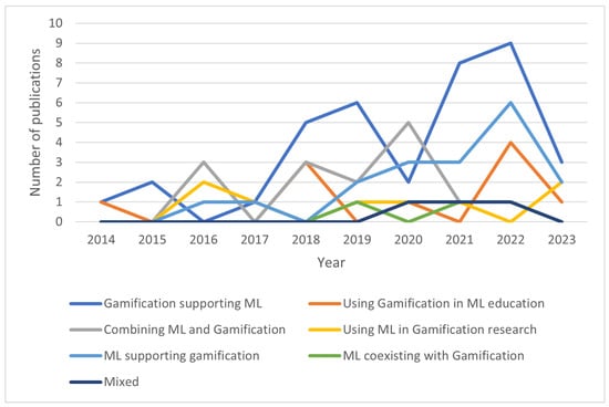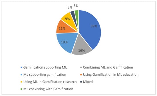 As can be observed in Figure 5, in the analyzed set, there are many more reports on gamification supporting machine learning (39%) than machine learning supporting gamification (19%). Papers reporting combining machine learning and gamification constituted 16% of the analyzed set. A little above of the analyzed papers were devoted to using gamification in machine learning education, whereas a little less than of the analyzed papers were devoted to using machine learning in gamification research. Only 3% of the analyzed papers described machine learning coexisting with gamification, and the same share was taken by papers mixed in character.