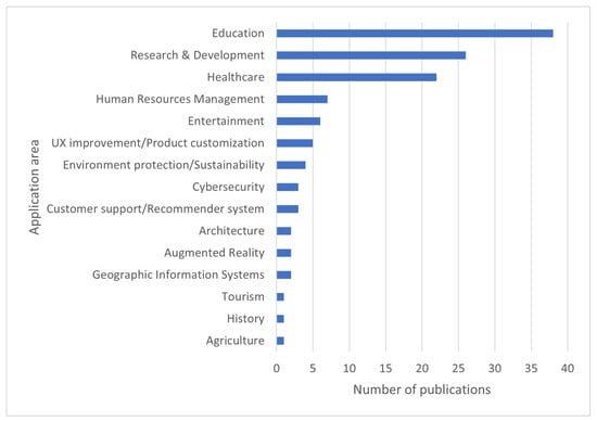 Analyzing the collected publications, we were able to determine 16 activity areas targeted by the application of machine learning and gamification described therein (note that some papers addressed more than one area). As can be observed in Figure 7, the most popular area was education (addressed by over 40% of the papers in the analyzed pool), followed by research and development (a little above of the papers), and healthcare (about 23% of the papers); no other area has been addressed by more than seven papers.