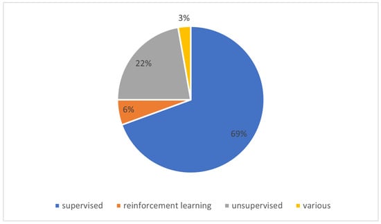 As for the more general distinction of machine learning types, we followed the traditional approach [13] and considered three of them (supervised, unsupervised, and reinforcement learning). As few papers mentioned various approaches, we have consequently added the “various” category.