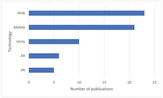 In Figure 10, one can see the main technologies (other than machine learning) on which the applications described in the identified publications were based: it includes only those technologies that were mentioned by more than one paper. As can be observed therein, the most often mentioned was web technology, followed by mobile technology (both surpassing the threshold of 20 publications). The only proper name of a technology that was mentioned in more than one paper of the analyzed set was Unity (by 10 publications). The other two technologies that made it to the chart were augmented reality (AR) and virtual reality (VR). Note that the technologies are not disjunct (the same application can be based on web technology, virtual reality, and Unity at the same time).