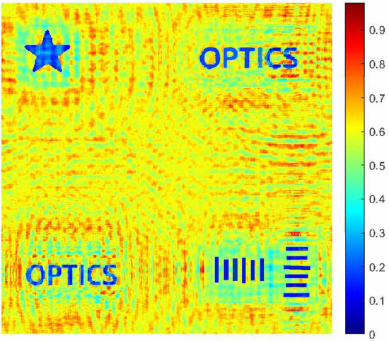 In the simulation, the size of the object and the photosensitive surface of the CCD were the same, the diffraction distance from the farthest object to the CCD was 0.93 m, and the three measured objects were uniformly distributed in the z-direction within the range of the depth of field—namely 0.62 m. The sample size of the CCD was pixels, and the whole sensitive area was mm. Image reconstruction was performed in steps of 0.062 m. The actual position of the reconstructed image should be at the coordinates with step index values of 50, 55, and 60. The simulations are performed by MATLAB R2023a.
