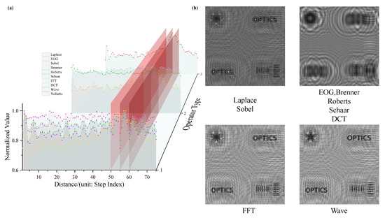 The of the single-depth operator was , as calculated using Equation (4) for the reconstructed image in Figure 8a, and the of the proposed algorithm was in Figure 8b. After synthesizing the between-display and quantization calculation in Figure 8, it can be seen that the digital holographic depth of field under the inverse cross-correlation calculation was greatly extended in the non-overlapping state, and the measurement of multiplanar objects was realized.