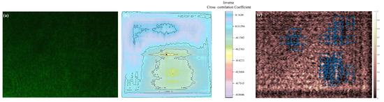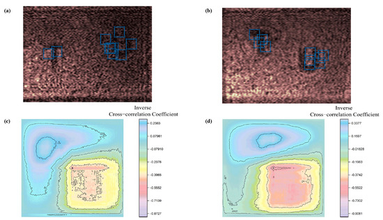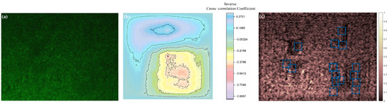 In two-dimensional images, similarity is defined as in Equation (3), where is the cross-correlation matrix of the image; and are the weighting cross-correlation image and the template image, respectively; denotes the light intensity value of the weighting image at pixel ; is the average value of in the range of the template image ; and is the template average.