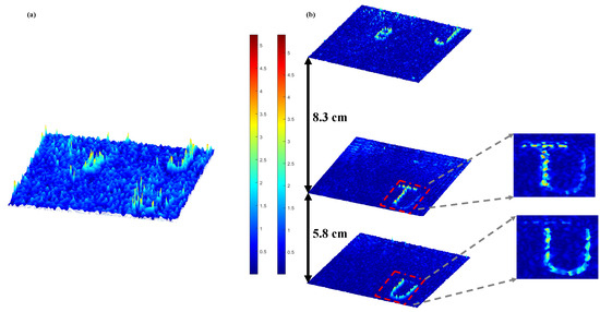 The results are shown in Figure 8. Figure 8a shows the reconstructed phase distribution in the case of a single-depth estimation operator’s extreme point; at this time, the reconstruction distance z = 21.0 cm. The color bars indicate the phase values. It can be seen that, due to the mutual interference of the various planes, the phase is blurred, and the actual different positions of the measured object are forced to be reproduced in the same plane and thus cannot be accurately distinguished. Additionally, the reconstruction of the phase represents the error. Figure 8b shows the reconstructed image under the method proposed in this paper. The phase of each plane is clearly visible, and the relative positional distance between planes can be obtained: BJ and T are 7.2 cm apart, and T and U are 6.1 cm apart.
