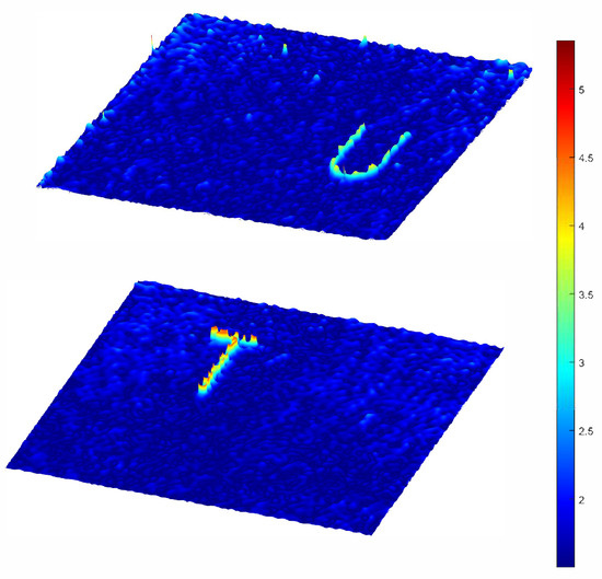Figure 9a shows the hologram obtained via CCD, and Figure 9b shows the inverse cross-correlation number matrix under = 12.0 cm and = 18.0 cm. Since T and U overlapped with each other in the four measured objects at this time, three different sizes for the rectangular boxes were chosen to be reconstructed in turn, in which S, M, and L were 30, 50, and 80 pixels, respectively. In addition, Figure 9c shows the schematic diagram of the M × M rectangular box. The color bar values indicate the normalized amplitude.